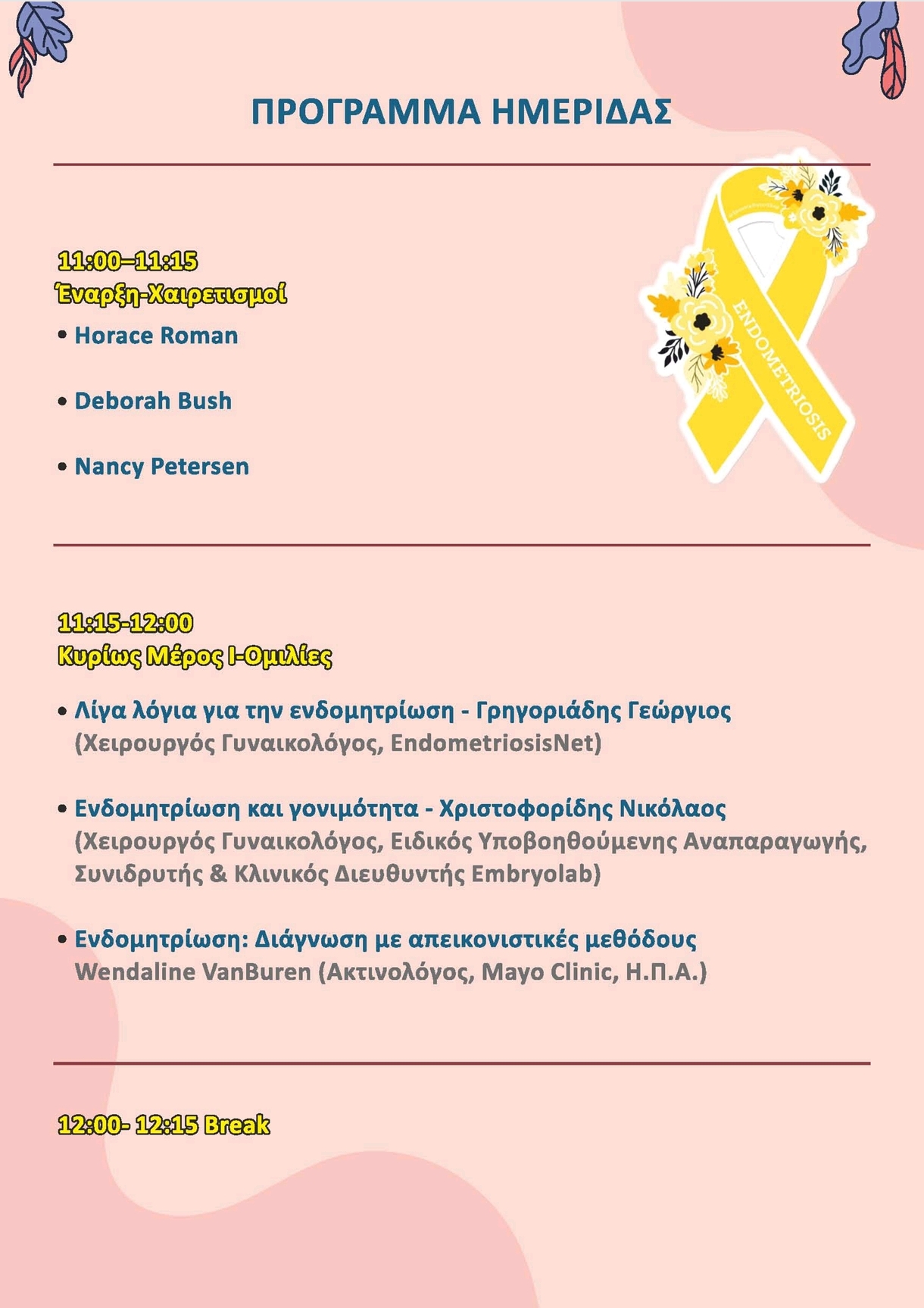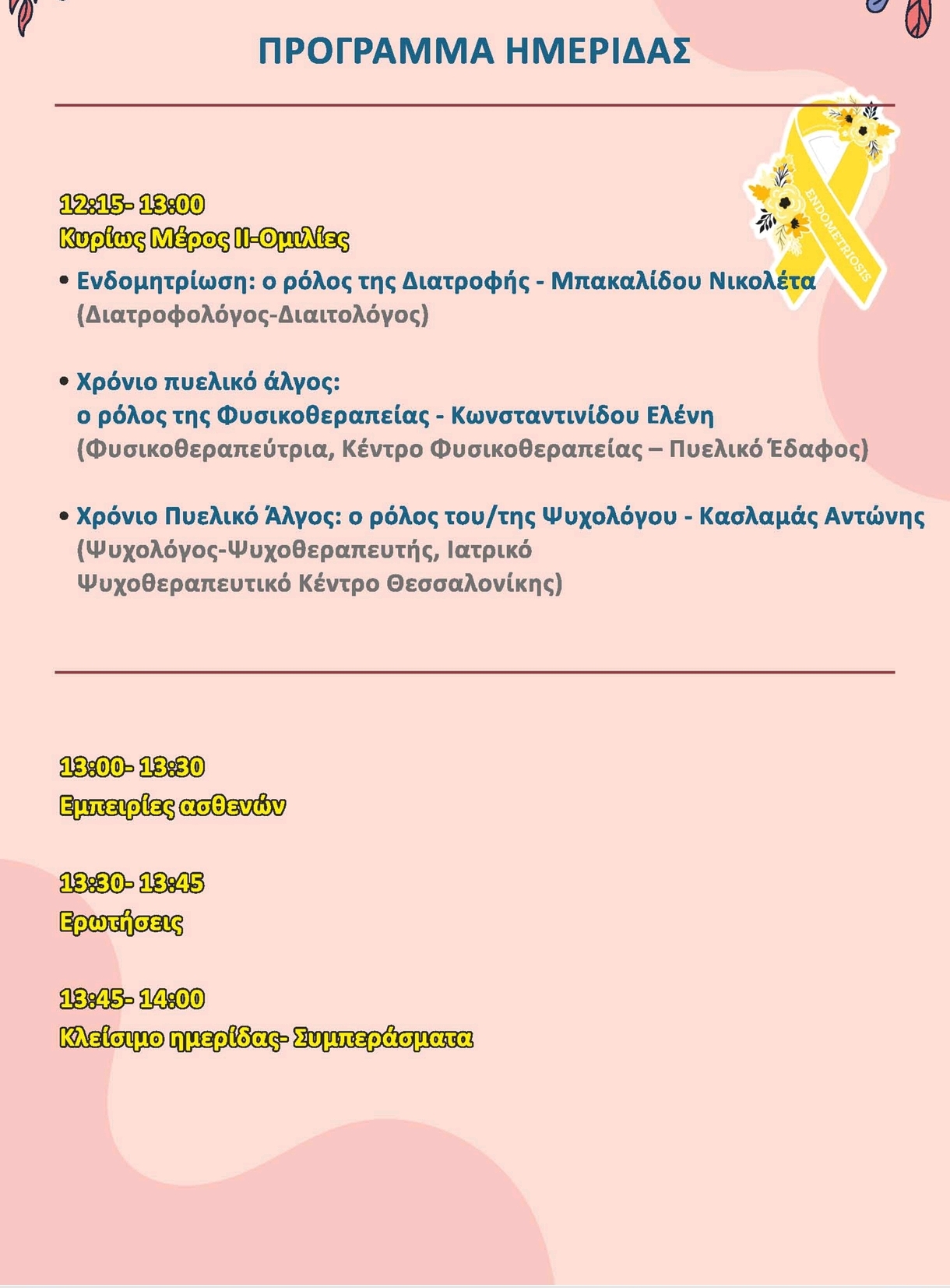 Συγκεκριμένα, κατά τη διάρκεια της ημερίδας, θα καλύψουμε θέματα όπως η διάγνωση της ενδομητρίωσης, οι μέθοδοι αντιμετώπισης, η αντιμετώπιση της υπογονιμότητας, καθώς και ο ρόλος της διατροφής, της φυσικοθεραπείας πυελικού εδάφους αλλά και του/της ψυχολόγου σε γυναίκες με ενδομητρίωση.